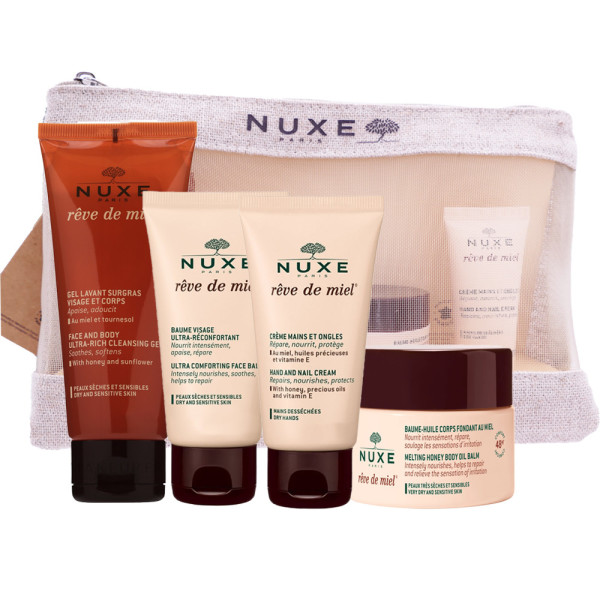 NUXE RÊVE DE MIEL TROUSSE 4 SOINS : Découvrez l'hydratation et le réconfort en vente en ligne, sur le site de votre parapharmacie à prix pas cher. Cette trousse regroupe quatre soins essentiels pour une peau douce et apaisée.