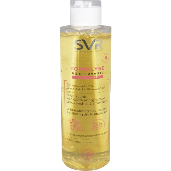 TOPIALYSE Huile lavante micellaire de SVR non grasse, est un soin d’hygiène complet pour agir sur tous les facteurs de la sécheresse. Riche en oméga 3-6 et 9, ce soin d’hygiène à la base lavante douce sans savon, a une action protectrice et apaisante pour restaurer efficacement la barrière cutanée et la protéger des agressions quotidiennes, et de l’apparition de nouvelles irritations, et calmer de toute sensation de grattage et démangeaisons. Associé à la niacinamide et au complexe Nutritive Complex, l’Huile micellaire va avoir des propriétés relipidantes et hydratantes pour assouplir la peau La peau retrouve immédiatement confort et souplesse après la toilette. Hypoallergénique, sans savon, sans paraben, sans sulfate, sans conservateurs, testé sur peaux sensibles et sous contrôle dermatologique, ophtalmologique, pédiatrique et gynécologique et sur peaux sensibles.