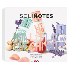 La marque Solinotes, connue pour ses créations parfumées innovantes, propose ce coffret avec trois fragrances distinctes en flacons de 15 ml. Chaque parfum se distingue par sa texture légère et sa composition soigneusement élaborée pour offrir une expérience sensorielle agréable. Les ingrédients actifs incluent des notes de pistache, de litchi et de lavande, chacun apportant une signature olfactive unique et séduisante. Le parfum Pistache se caractérise par sa douceur gourmande, idéale pour ceux qui recherchent une senteur réconfortante. Le Litchi, avec ses notes fruitées et exotiques, apporte une touche de fraîcheur et de dynamisme. Enfin, la Lavande, classique et apaisante, offre une sensation de sérénité et de bien-être.