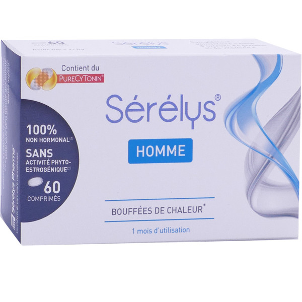 Sérélys Homme est un complément alimentaire à base d'actifs d'origine naturelle : les complexes PureCyTonin (brevet déposé par les laboratoires Sérélys Pharma, à base d'extraits cytoplasmiques spécifiques et purifiés de pollens). Grâce à ces complexes PureCytonin, Sérélys Homme permet de réduire les bouffées de chaleur. Avec ses 320 mg de PureCyTonin et ses 10 mg de vitamine E antioxydante par jour, Sérélys pour Homme participe au bien-être des hommes souffrant de bouffées de chaleur. 100% non hormonal.