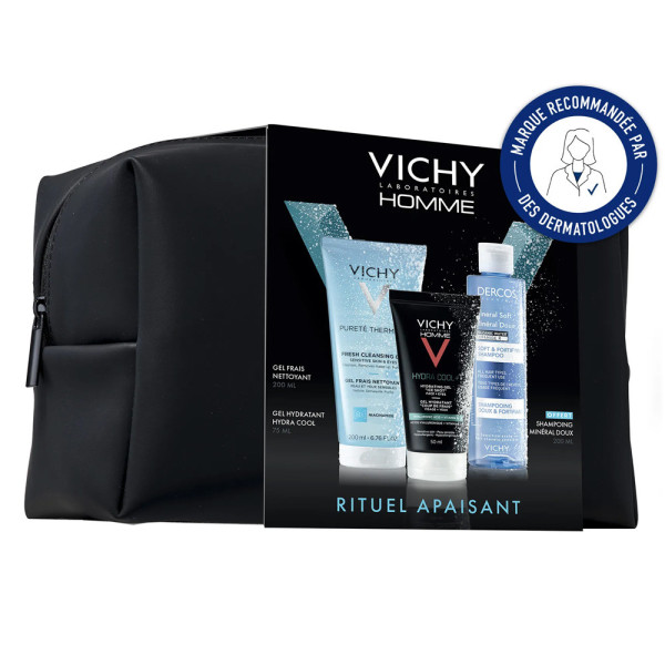 VICHY TROUSSE HOMME RITUEL APAISANT est en vente en ligne sur le site de votre parapharmacie à prix pas cher, offrant une solution complète pour le soin quotidien des peaux sensibles masculines.