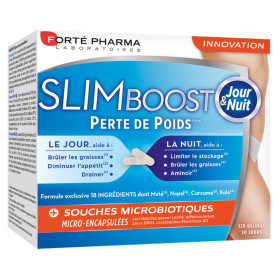 Les laboratoires FORTÉ PHARMA ont élaboré différentes gammes et univers de produits pour vous accompagner dans la vie de tous les jours et vous aider à rester en forme, à préserver votre capital santé et beauté. L’univers Minceur de FORTÉ PHARMA propose notamment les gammes de produits et compléments alimentaires pour vous aider à Perdre du poids, Drainer et détoxifier, Gérer son poids et Minceur ciblée. Slim boost ventre plat est spécialement formulé pour accompagner les femmes qui souhaite avoir un ventre plus plat. Sa formule associe de la glutamine, de la leucine, du kola, du maté, du carvi et un mélange de 2 souches microbiotiques. Le Kola aide à brûler les graisses et le Carvi facilite la digestion et réduit les sensations de ballonnements. La formule est complétée par du calcium qui contribue au bien-être digestif, de l’inuline de chicorée, des acides aminés (L-leucin, L-glutamine), des vitamines B6 et B8 et 2 souches microbiotiques micro-encapsulées (Bifidobacterium breve BR03 et Bifidobacterium lactis BS0).
