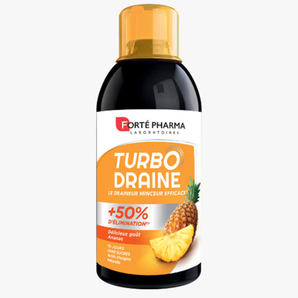 TURBODRAINE de Forte Pharma à prix pas cher, le complément alimentaire en solution à boire sans colorant dans votre parapharmacie en ligne pas cher, aux extraits de Reine des Prés et de Thé vert qui stimulent les fonctions d’élimination de l’organisme. Saveur Ananas