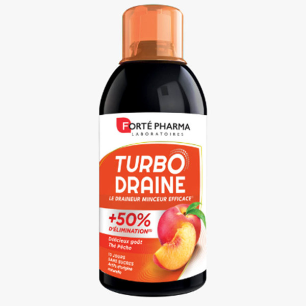 TURBODRAINE de Forte Pharma à prix pas cher, le complément alimentaire en solution à boire sans colorant dans votre parapharmacie en ligne pas cher, aux extraits de Reine des Prés et de Thé vert qui stimulent les fonctions d’élimination de l’organisme. Saveur thé/pêche