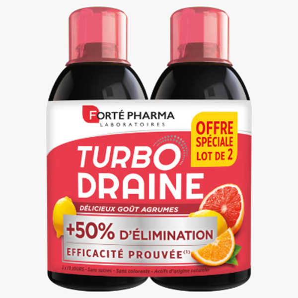 TURBODRAINE de Forte Pharma Lot de 2 Goût Agrumes à prix pas cher, le complément alimentaire en solution à boire sans colorant dans votre parapharmacie en ligne pas cher, aux extraits de Reine des Prés et de Thé vert qui stimulent les fonctions d’élimination de l’organisme.