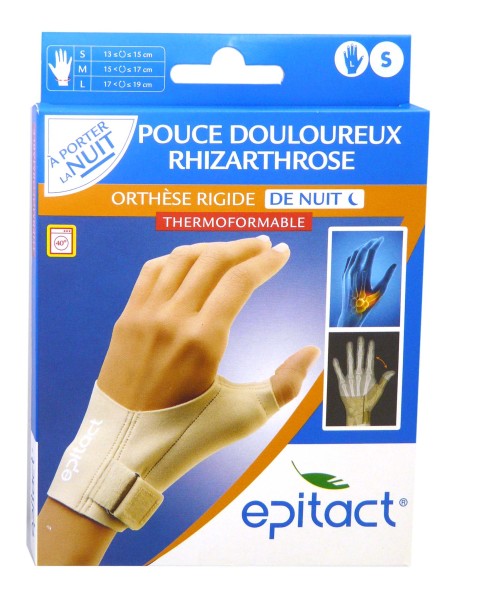 Orthèse Pouce de Nuit d'EPITACT, la prothèse qui protège et soulage les douleurs liées à des inflammations (rhizarthrose) de la base du pouce droit pendant le sommeil. Taille S