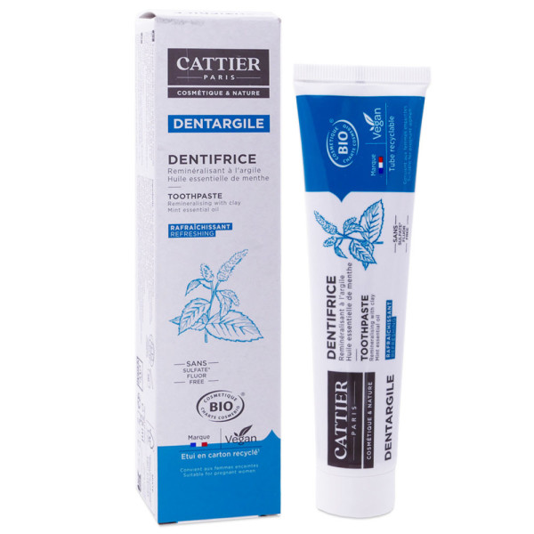 Le dentifrice rafraîchissant Dentargile de CATTIER, enlève le tartre et renforce l’émail des dents, tonifie les gencives et donne à l’haleine une grande fraîcheur grâce à sa richesse en argile de composition minérale complexe, en huile essentielle de menthe bio et en sel marin qui est riche en oligo-éléments.