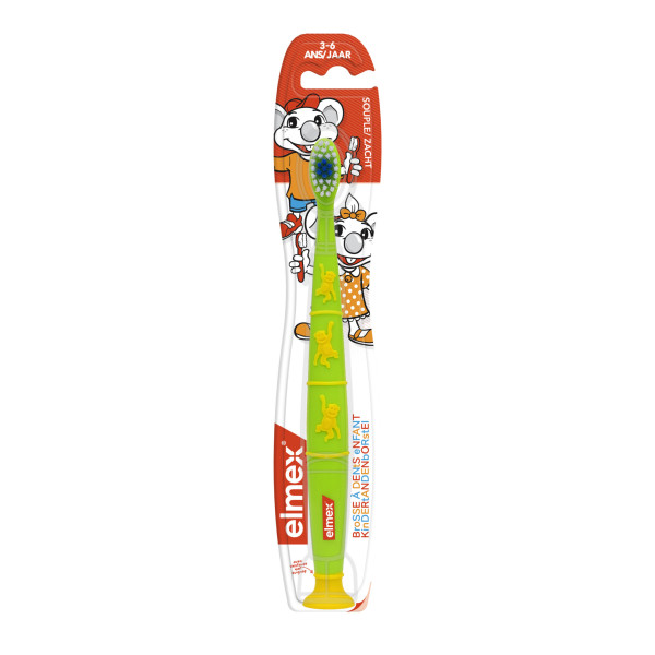 Elgydium brosse à dents nettoie tout en douceur les dents de lait des touts petits de 3 à 6 ans.