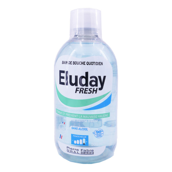 Eluday Fresh pas cher des laboratoires Pierre Fabre Oral Care, un bain de bouche rafraichissant pour une bouche saine et une haleine fraîche pendant 12 heures, dans votre parapharmacie en ligne à prix pas cher. Pour toute la famille (à partir de 12 ans).