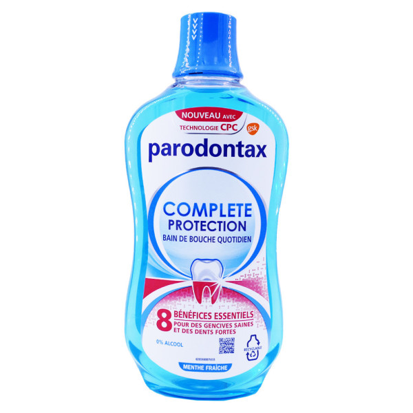 Le Bain de bouche Complete Protection de PARODONTAX sans alcool, a spécialement été formulé pour compléter le brossage dentaire et assurer une hygiène bucco-dentaire parfaite en aidant à réduire la plaque dentaire et la sensibilité des gencives. Grâce à une combinaison unique d’actifs, ce bain de bouche permet 8 actions pour une hygiène optimale : il élimine le tartre ainsi que la plaque dentaire, combat les bactéries qui causent la mauvaise haleine et la plaque dentaire, protège contre les caries, renforce l’émail, nettoie parfaitement entre les dents et autour de la gencive et procure à l’haleine une fraîcheur mentholée. Les gencives sont saines, les dents protégées et renforcées au quotidien.