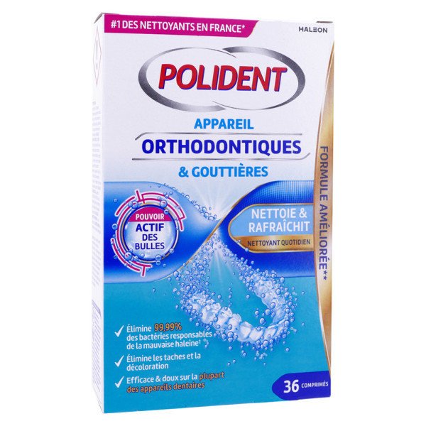 POLIDENT NETTOYANT FORMULE APPAREILS ORTHODONTIQUES ET GOUTTIERES 36 COMPRIMES est en vente en ligne sur le site de votre parapharmacie à prix pas cher, ce nettoyant est conçu pour l'entretien quotidien des appareils orthodontiques et des gouttières.