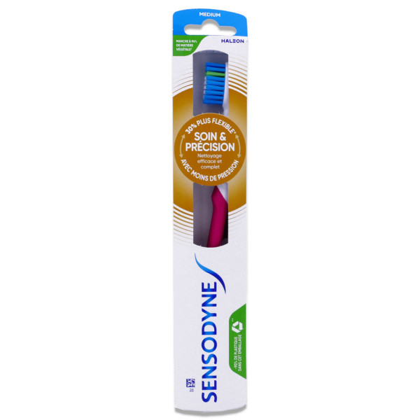 Mode d'emploi : Utilisez la brosse à dents Sensodyne Soin & Précision Medium deux fois par jour avec un dentifrice fluoré.