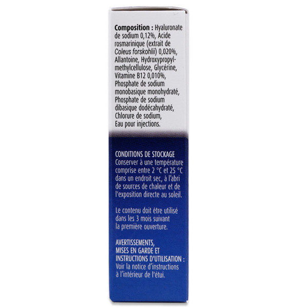 Hyaluronate de sodium 0,12%, acide rosmarinique (extrait de coleus forskohlii) 0,020%, allantoine, hydroxypropylmethylcellulose, glycérine, vitamine B12 0,10%, phosphate de sodium monobasique monohydraté, phosphate de sodium dibasique dodécahydraté, chlorure de sodium, eau pour injections.