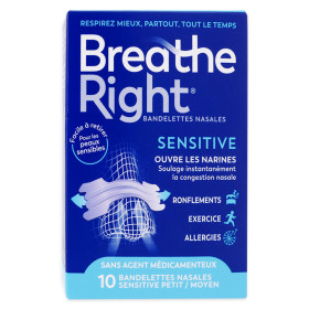 Les bandelettes nasales Sensitive BREATHE RIGHT pas cher, la solution non médicamenteuse sous forme de bandelette sur le nez dans votre parapharmacie en ligne à prix pas cher, pour mieux respirer, soulager la congestion nasale et réduire les ronflements. Pour peaux sensibles Taille petit/moyen