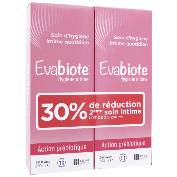 EVABIOTE HYGIÈNE INTIME ACTION PREBIOTIQUE LOT DE 2X250ML à prix pas cher, le soin d’hygiène respectueuse de la zone intime sensible ou agressée de la femme (sècheresse, démangeaison, sensation d’inconfort), dans votre parapharmacie en ligne à prix pas cher.