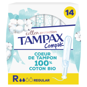 Insérez délicatement le tampon TAMPAX COMPAK 14 REGULAR dans le vagin. Changez toutes les 4 à 8 heures. Ne pas utiliser pendant plus de 8 heures. Lisez attentivement la notice avant utilisation.