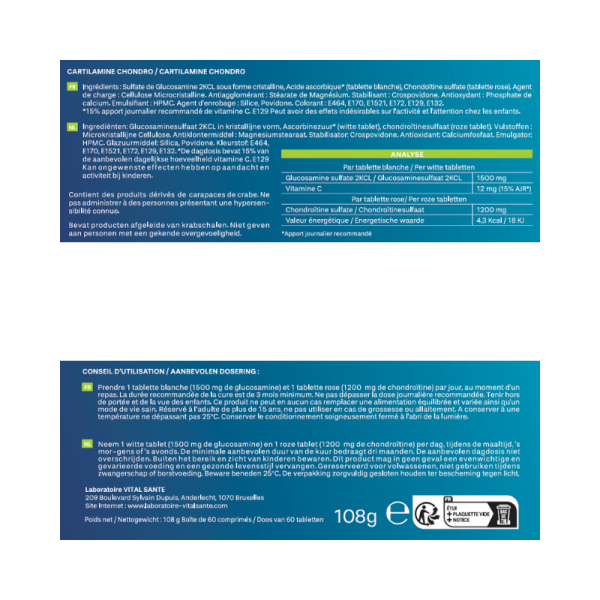 Complément Alimentaire à base de: Sulfate de glucosamine 2KCL sous forme cristalline, acide ascorbique* (tablette blanche), chondroïtine sulfate (tablette rose). Agent de charge : cellulose microcristalline. Antiagglomérant : Stéarate de magnésium. Stabilisant : Crospovidone. Antioxydant : Phosphate de calcium. Emulsifiant : HPMC. Agent d'enrobage : Silice, Povidone. Colorant : E464, E170, E1521, E172, E129, E132.