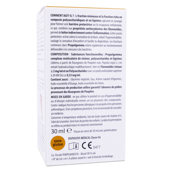 Le spray Propolgemma pour adultes est conseillé pour atténuer les douleurs de gorge et les problèmes buccaux, comme les stomatites, les aphtes et les gingivites, qui provoquent des sensations de brûlure, des douleurs et des difficultés à déglutir. Ce produit peut également offrir une protection préventive contre des agressions extérieures nocives ou irritantes, telles que le froid, la fumée ou la pollution ; ou en cas de petites lésions buccales dues, par exemple, à des traitements dentaires ou à l’utilisation d’appareils orthodontiques et de dentiers.. La fraction résineuse, en synergie avec celle riche en polysaccharides et lignines, participe à la formation d'une barrière protectrice sur la muqueuse irritée. Parallèlement, les propriétés antioxydantes des flavonoïdes jouent un rôle indirect dans la lutte contre l'inflammation. Cette couche protectrice et active aide à calmer les sensations de brûlure, réduit l'hypersensibilité, soulage l'inconfort et facilite la déglutition des aliments.
