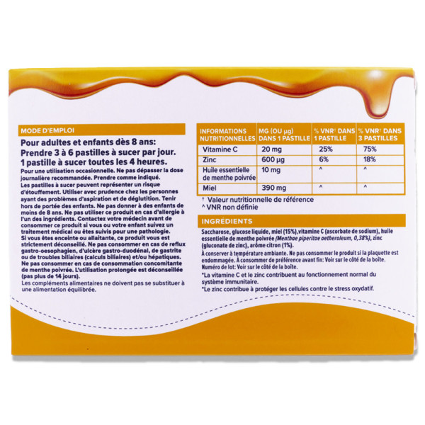 Complément alimentaire à base de vitamine C, zinc, huile essentielle et miel ; Sans conservateurs, sans lactose, sans OGM.