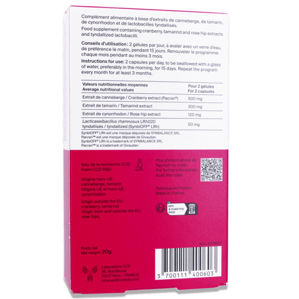 Complément alimentaire à base de plantes et de lactobacilles tynallisés, Sans allergène (lactose, soja, gluten) Sans conservateur Sans édulcorant Sans ingrédient d’origine animale Convient aux végétariens et végétaliensExtrait de canneberge Pacran® (Vaccinium macrocarpon), Extrait de tamarin (Tamarindus indica), Extrait de cynorrhodon (Rosa canina), Lactobacilles tyndallisés (Lacticaseibacillus rhamnosus LRH020), Fécule de manioc, agent de charge : gomme d’acacia, Anti-agglomérant : phosphates de calcium, Enveloppe : gélule d’origine végétale (hydroxypropylméthylcellulose).