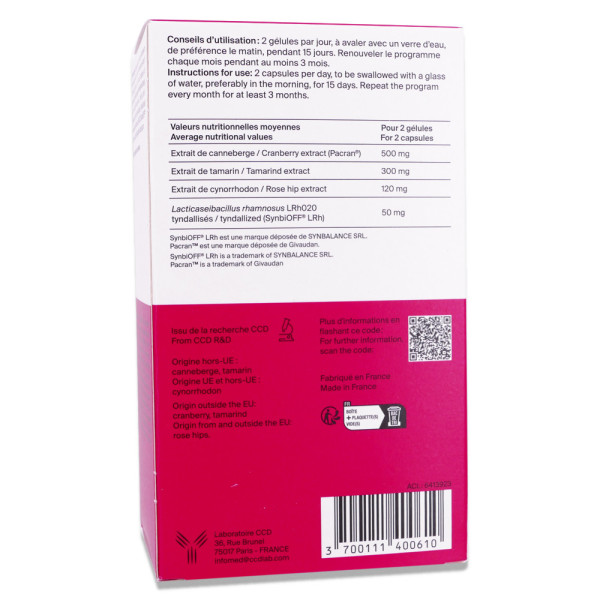 Complément alimentaire à base de plantes et de lactobacilles tynallisésSans allergène (lactose, soja, gluten) Sans conservateur Sans édulcorant Sans ingrédient d’origine animale Convient aux végétariens et végétaliensExtrait de canneberge Pacran® (Vaccinium macrocarpon), Extrait de tamarin (Tamarindus indica), Extrait de cynorrhodon (Rosa canina), Lactobacilles tyndallisés (Lacticaseibacillus rhamnosus LRH020), Fécule de manioc, agent de charge : gomme d’acacia, Anti-agglomérant : phosphates de calcium, Enveloppe : gélule d’origine végétale (hydroxypropylméthylcellulose).La liste des ingrédients peut être soumise à des variations, nous vous conseillons de toujours vérifier la liste figurant sur le produit acheté.
