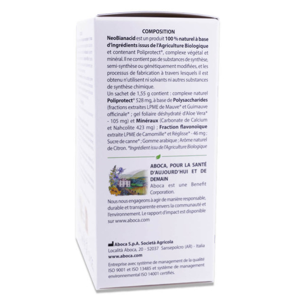 Formule 100 % naturelle à base d’ingrédients issus de l’Agriculture Biologique et contenant Poliprotect®, complexe végétal et minéral.Un sachet de 1,55 g contient : complexe naturel Poliprotect® 528 mg, à base de Polysaccharides (fractions extractives LPME de Mauve* et Guimauve officinale* ; gel foliaire déshydraté d’Aloe Vera* - 105 mg) et Minéraux (Carbonate de Calcium et Nahcolite 423 mg) ; Fraction flavonoïque extractive LPME de Camomille* et Réglisse* - 46 mg ; Sucre de canne* ; Gomme arabique ; Arôme naturel de Menthe.*Ingrédient issu de l’Agriculture BiologiqueLes fractions extractives contenues dans le produit sont obtenues par un processus technologique exclusif, appelé LPME (Liquid-Phase Microextraction), développé par la recherche Aboca.