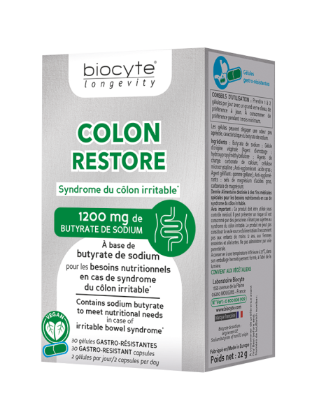 BioCyte Colon Restore est un produit destiné aux personnes atteintes du syndrome du côlon irritable. Il contient du butyrate de sodium, un acide gras produit par les bactéries intestinales à partir des fibres alimentaires. Le butyrate de sodium est la principale source d'énergie pour les cellules du côlon. La gélule de BioCyte Colon Restore est végétale et gastro-résistante, ce qui permet la protection des actifs du produit et de les libérer directement dans le colon. Commandez dès maintenant sur notre site de parapharmacie à prix pas cher et profitez d'une livraison rapide.