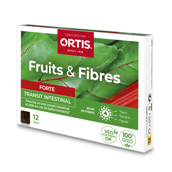 FRUITS & FIBRES Forte Transit Intestinal Action Rapide d’ORTIS pas cher, des cubes riches en fibres alimentaires dans votre parapharmacie en ligne à prix pas cher, avec de la rhubarbe, du Carvi, des figues et du tamarin.