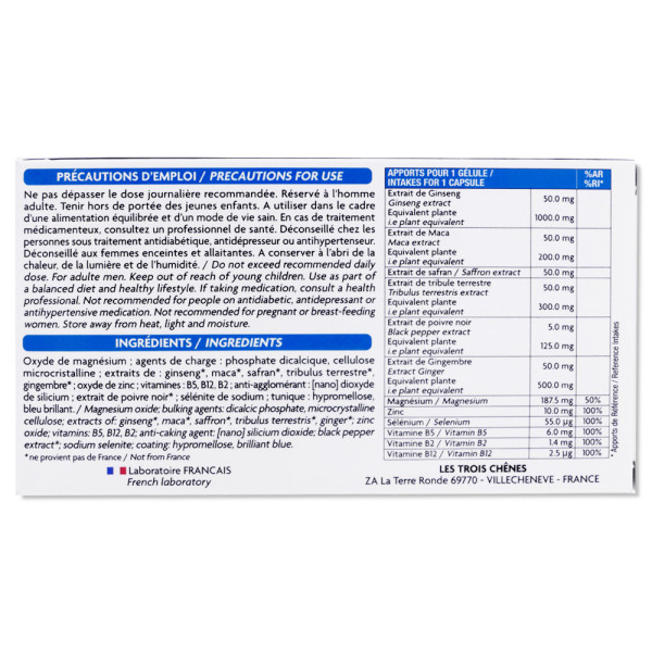 L-Arginine (34.15%), Extrait De Muira Puama (21.35%), Oxyde De Magneisum (17%), Anti-Agglomerants, Stearate De Magnesium, Silice Precipitee (Nano), Extrait De Ginseng (5.12%), Extrait De Safran (4.78%), Sulfate De Zinc (4.69%), Extrait De Guarana (1.42%), Vitamines C Et B5, Extrait De Tribule Terrestre (2.40%), Extrait De Piment De Cayenne (0.29%), Extrait De Poivre Noir (0.03%), Selenite De Sodium (0.004%), Gelule (Gelatine, Colorant : Dioxyde De Titane, Indigotine).
