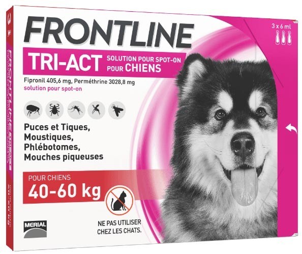 FRONTLINE est un traitement révolutionnaire facile d’application grâce à son conditionnement en pipette, lequel déposé sur la peau de votre animal, permet de traiter les infestations, protéger et repousser les puces, insectes volants (phlébotomes, moustiques, mouches piqueuses) et les tiques. Ce médicament à base de fipronil et perméthrine, va rapidement et pour longtemps tuer et éliminer les puces et les tiques, et repousser les insectes volants. FRONTLINE Tri-Act va agir dans les 24 et 48h suivant l’arrivée des parasites : 24 heures pour les puces et 48 heures pour les tiques. L’animal est protégé de la ré infestation pendant 3 semaines des phlébotomes, 4 semaines pour les puces les tiques et les moustiques, et 5 semaines pour les mouches piqueuses. Attention : FRONTLINE Tri-Act contient de la perméthrine, qui est contre-indiqué sur les chats.