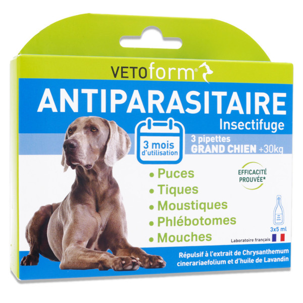 VETOFORM ANTIPARASITAIRE GRAND CHIEN 3 PIPETTES est en vente en ligne sur le site de votre parapharmacie à prix pas cher, offrant une protection antiparasitaire pour les grands chiens.