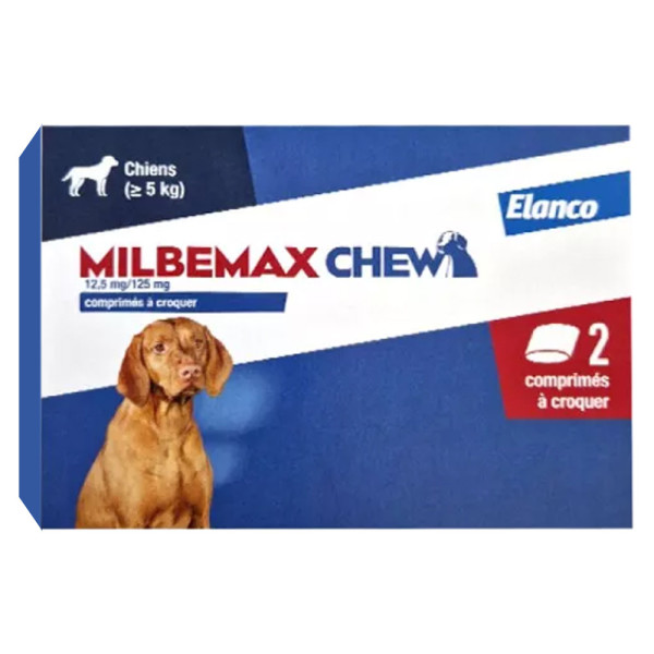 ELANCO MILBEMAX CHEW CHIENS SUPP 5KG 2 COMPRIMES est en vente en ligne sur le site de votre parapharmacie à prix pas cher pour le soin des chiens pesant dès 5 kg et plus.