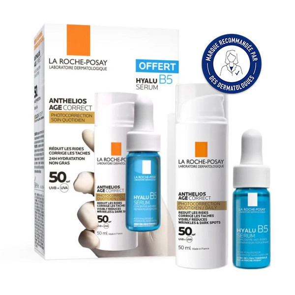 LA ROCHE POSAY ANTHELIOS AGE CORRECT SPF50 50ML + HYALU SERUM B5 10ML en vente en ligne, sur le site de votre parapharmacie à prix pas cher. Découvrez le duo parfait pour protéger et hydrater votre peau avec La Roche Posay Anthelios Age Correct SPF50 et Hyalu Serum B5.
