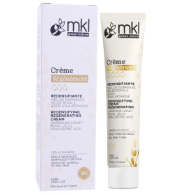 La crème régénérante MKL provient de la marque MKL Green Nature, reconnue pour ses formulations naturelles et respectueuses de la peau. Sa texture onctueuse et fondante pénètre rapidement pour une sensation de bien-être immédiate. Parmi ses ingrédients actifs, le miel de garrigues bio est connu pour ses propriétés hydratantes et adoucissantes, tandis que la gelée royale bio contribue à nourrir et revitaliser la peau. L'acide hyaluronique, quant à lui, est apprécié pour son effet repulpant et hydratant, aidant à maintenir l'élasticité et la fermeté de la peau.