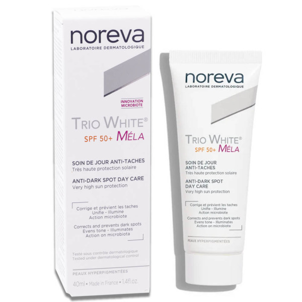 TRIO WHITE MELA SPF50+ CR SOIN JOUR 50ML est en vente en ligne sur le site de votre parapharmacie à prix pas cher, offrant une protection solaire élevée pour les peaux sujettes aux irrégularités pigmentaires du visage,