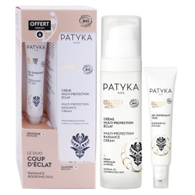 Le duo « Coup d’Eclat » pas cher de PATYKA, des soins bio pour permettre de retrouver un teint éclatant, dans votre parapharmacie en ligne à prix pas cher. Ce duo contient : Crème Multi-Protection Éclat (50ml) ; Gel Energisant Yeux (15ml) offert.