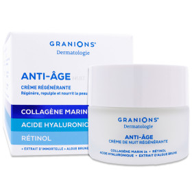 GRANIONS DERMATOLOGIE CREME DE NUIT REGENERANTE ANTI-AGE 50ML est en vente en ligne sur le site de votre parapharmacie à prix pas cher, offrant une solution de soin nocturne pour les peaux matures.