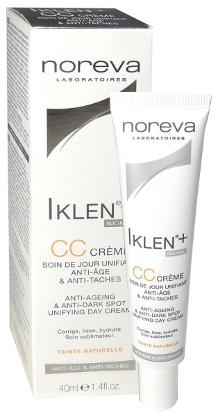 La gamme Iklen+ des laboratoires NOREVA est composée de soins dépigmentant pour corriger les taches existantes pouvant être la cause du changement hormonale, de cicatrices, de photsensibilisation médicamenteuse,…, prévenir l’apparition de nouvelles taches et unifier le teint. La formule de la CC Crème Soin de jour Iklen+ contient du Rucinol qui est un actif dépigmentant très puissant, qui va agir au cœur des cellules cutanées sur la synthèse de la mélanine en diminuant sa quantité responsable de la coloration excessive et de la formation des taches. Associé à des céramides, la CC Crème va par ses propriétés rlipdantes et hydratantes, adoucir la peau et la lisser afin d’estomper les rides. Les pigments qui complètent la formule vont homogénéiser le teint afin de redonner de l’éclat au visage. Excellente base de maquillage. Sans paraben, testé sous contrôle dermatologique