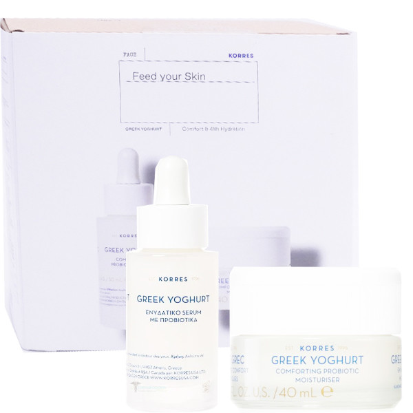 Le Coffret « Feed Your Skin » pas cher de KORRES, 2 soins ultra-hydratant à l’action anti-stress et anti-pollution à base de probiotiques et véritable yogourt grec dans votre parapharmacie ne ligne à prix pas cher, pour protéger et hydrater intensément la peau. Visage Crème Hydratante confort et Sérum Confort Intense