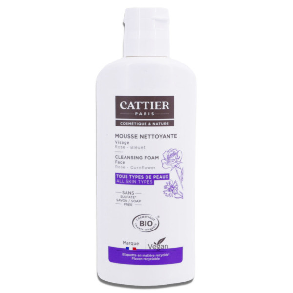 La Mousse nettoyante de CATTIER, à la texture ultra-légère qui se transofrme en mousse fine et aérienne au contact de la peau mouillée, est le soin douceur pour éliminer les impuretés du visage tout en purifiant et hydratant la peau. Riche en protéines de blé aux propriétés nourrissantes et hydratantes, elle nettoie, hydrate et purifie la peau en profondeur et tout en douceur. Les eaux florales de rose et de bleuet bio apaisantes et adoucissantes rafraîchiront la peau pour la laisser délicatement parfumée. La peau est douce, saine et parfaitement nettoyée. Sans savon ni sulfates
