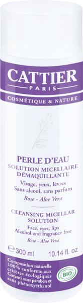 Perle d'eau solution démaquillante de CATTIER est une solution qui élimine le maquillage sans agresser, répare, protège et apaise la peau qui peut être agressée par le maquillage, hydrate et redonne à la peau une grande pureté grâce à sa richesse en eau florale de rose bio, et à l’aloe vera bio.