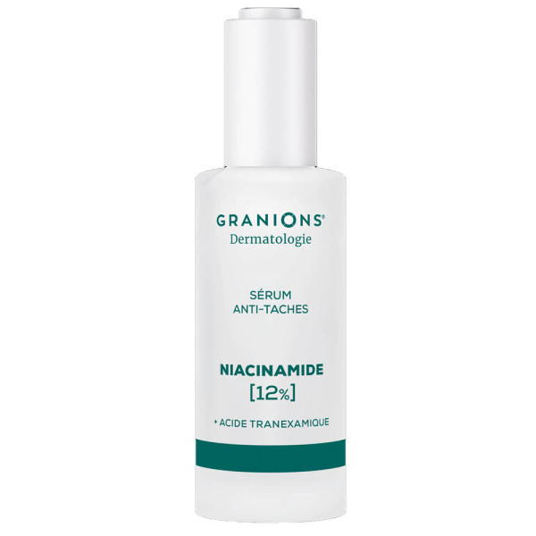 GRANIONS DERMATOLOGIE SERUM ANTI-TACHES NIACINAMIDE 30ML est en vente en ligne sur le site de votre parapharmacie à prix pas cher, conçu pour atténuer l'apparence des taches pigmentaires et unifier le teint.