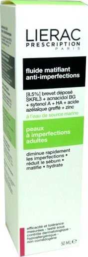 Les produits de la gamme peaux à imperfections adultes de LIERAC PRESCRIPTION sont conçus pour offrir des soins ciblés aux peaux ternes, brillantes, à pores dilatés et imperfections visibles grâce à des actifs rigoureusement sélectionnés pour leurs propriétés rééquilibrantes, sébo-régulatrices, assainissantes, apaisantes ou hydratantes. Tous les soins sont testés sous contrôle dermatologique, hypoallergéniques, non comédogènes, sans paraben ni colorant et leur parfum est sans allergène. Le fluide matifiant, à la texture légère et non grasse, est spécialement formulé pour matifier, hydrater et réduire les imperfections des peaux mixtes adultes. Sa composition associe la technologie SKRL3 : eau de source marine/probiotique/ sucre biotechnologique qui répare, rééquilibre et protège la barrière cutanée, à de l’Acnacidol BG aux propriétés sébo-régulatrices, du Sytenol A apaisant, 3 hydroxy acides, de l’acide azélaïque antiseptique greffé sur de la glycérine hydratante, du zinc anti-oxydant et purifiant et des poudres absorbantes pour matifier la peau.