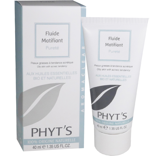 Fluide matifiant Pureté aux huiles essentielles 100% d’origine naturelle du laboratoire PHYT’S, issu de la naturo-esthétique dans votre parapharmacie en ligne à prix pas cher, pour hydrater et matifier en douceur tout en purifiant les peaux grasses à tendance acnéique.