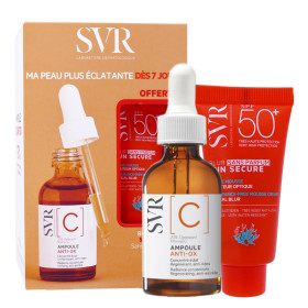 Le coffret est proposé par la marque SVR, reconnue pour ses soins dermatologiques de haute qualité. Ce coffret contient une sélection de produits aux textures agréables et aux propriétés cosmétiques efficaces. Le sérum SVR Ampoule [C] Anti-Ox de 30 ml, inclus dans le coffret, est un sérum illuminateur enrichi en vitamine C optimisée, qui contribue à donner de l'éclat à la peau et à réduire visiblement l'apparence des rides. Le coffret comprend également le SVR Sun Secure Blur SPF50+, une crème solaire qui offre une protection optimale contre les rayons UV, tout en lissant et unifiant le teint grâce à sa texture mousse floutante.