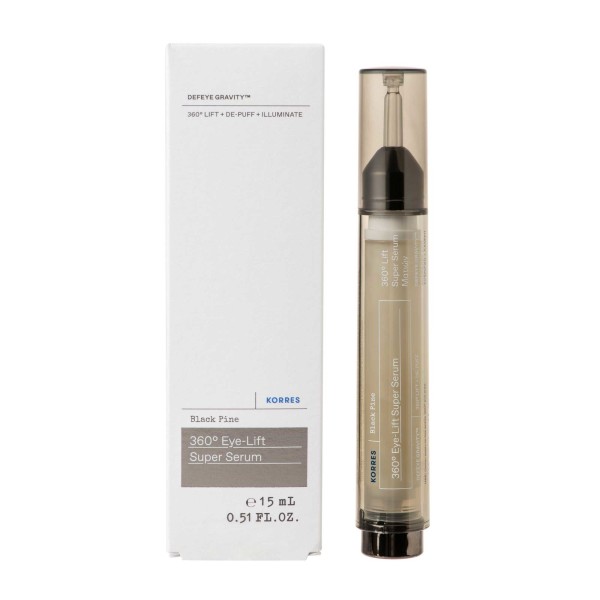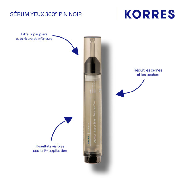 Le Super Sérum Liftant 360°Pin noir des laboratoires KORRES, à la texture fluide délicatement parfumée vite absorbée, est un soin concentré en pin noir, et hexapeptide 11 pour apporter fermeté, résistance, éclat et élasticité à la peau avec un effet lifting immédiat. Composée d’hexapeptide 11, le sérum va aider la peau à lutter efficacement contre les signes du temps et à se raffermir. L’extrait de pin noir (riche en polyphénols antioxydants) va raffermir la peau du contour des yeux et la lifter en profondeur pour une peau lisse et rajeunit, et redonner de l’éclat au regard. Le Complexe breveté DEFEYE GRAVITY va procurer un effet lifting instantané et lutter contre le relâchement de la paupière supérieure. Le regard retrouvera son éclat pour un contour des yeux plus frais et lumineux. La peau retrouvera sa fermeté et son élasticité pour des signes de l’âge estompés.