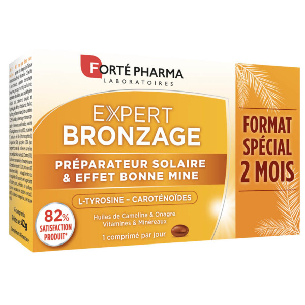 Les laboratoires FORTÉ PHARMA ont élaboré différentes gammes et univers de produits pour vous accompagner dans la vie de tous les jours et vous aider à rester en forme, à préserver votre capital santé et beauté. L’univers Beauté de FORTÉ PHARMA propose notamment les gammes de produits et compléments alimentaires Cheveux, Peau et Bronzage. Expert Bronzage est spécialement formulé pour préparer, activer et prolonger le bronzage naturel face aux agressions du soleil. Sa formule associe du manganèse, du sélénium, des vitamine C et E qui contribuent à la protection des cellules contre le stress oxydatif, des caroténoïdes d'origine naturelle et des huiles de cameline et d'onagre pour sublimer la peau et le teint.