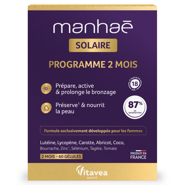 Manahé Solaire de NUTRISANTE conditionné sous forme de gélules, à base d’extraits de plantes naturels associés à des minéraux et pigments naturels, intervient de façon bénéfique sur la beauté de la peau du visage et du corps avant, pendant et après l’exposition au soleil. Le complexe de plantes (carotte et abricot) maintient un teint hâlé et lumineux grâce à leur teneur naturelle en caroténoïdes. Manhaé Solaire contient également du sélénium et du zinc antioxydants pour la protection des cellules contre le stress oxydatif. La formule est complétée par les pigments naturels (lutéine, lycopène) qui vont procurer un effet bonne mine.