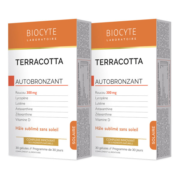 Terracotta Cocktail Autobronzant de BIOCYTE, le complément alimentaire à base de Roucou, lycopène, zéanthine et vitamine D pour un Hâle lumineux et uniforme dans votre parapharmacie en ligne à prix pas cher.