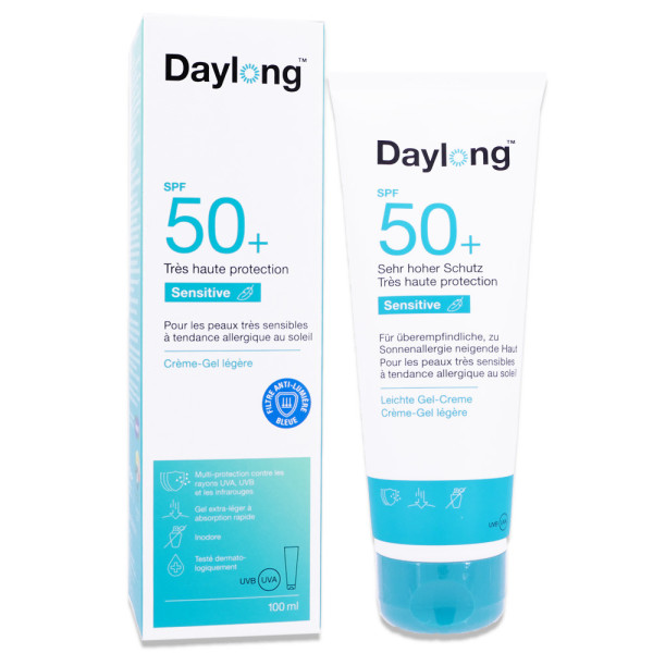 DAYLONG FACE SENSITIVE GEL FLUIDE LEGER 50+ 50ML est en vente en ligne sur le site de votre parapharmacie à prix pas cher, offrant une protection solaire haute performance pour le visage et le corps à peau très sensibleou à tendance allergique au soleil.